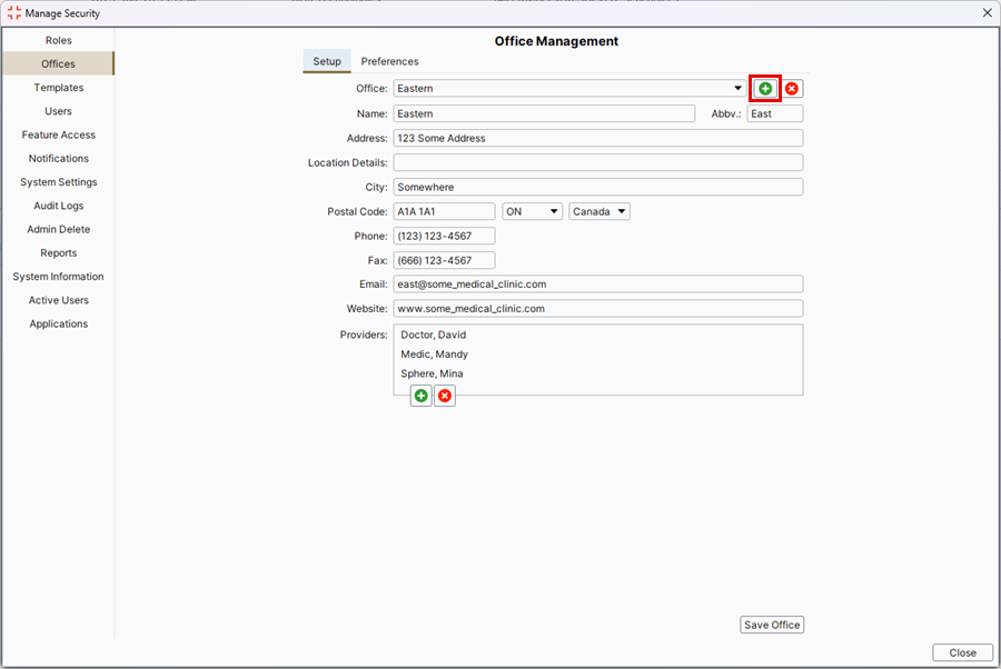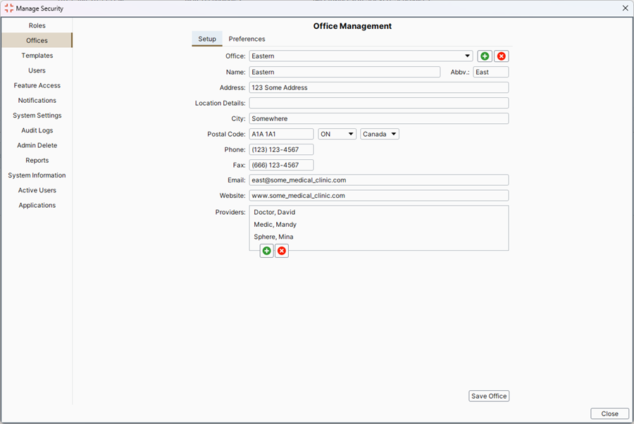 On this tab in Manage Security a user can select the office by clicking the arrow to the right of the Office field. Then User the fields below to enter the office information. Use the add and remove buttons in the Providers area to add and/or remove providers from each office, as required.