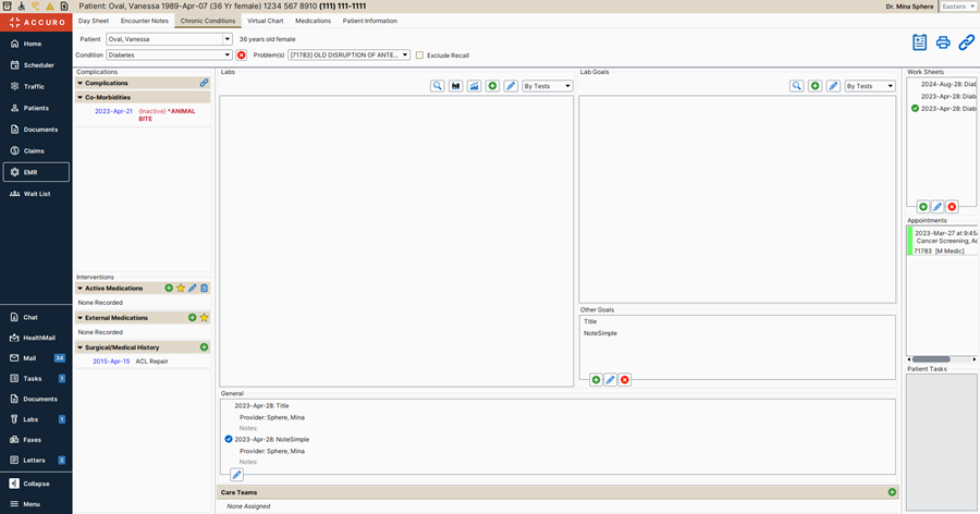 The middle area contains, labs, goals, general patient encounter notes and forms, and any care teams assigned to the patient. A detailed discussion of goals and care teams can be found below.