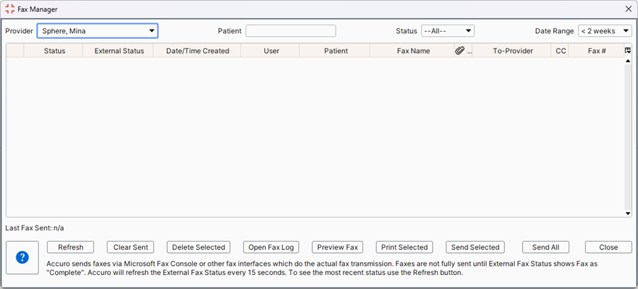 - The last two weeks of faxes are now displayed by default. Users can view faxes of a different age by selecting the appropriate option from the Sent Faxes Age dropdown. If this option is changed then Accuro remembers the selection for next time the Fax Manager is opened.