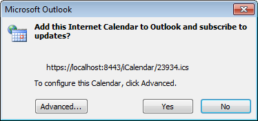 - A window is displayed asking to confirm adding the calendar to Outlook, click Yes.