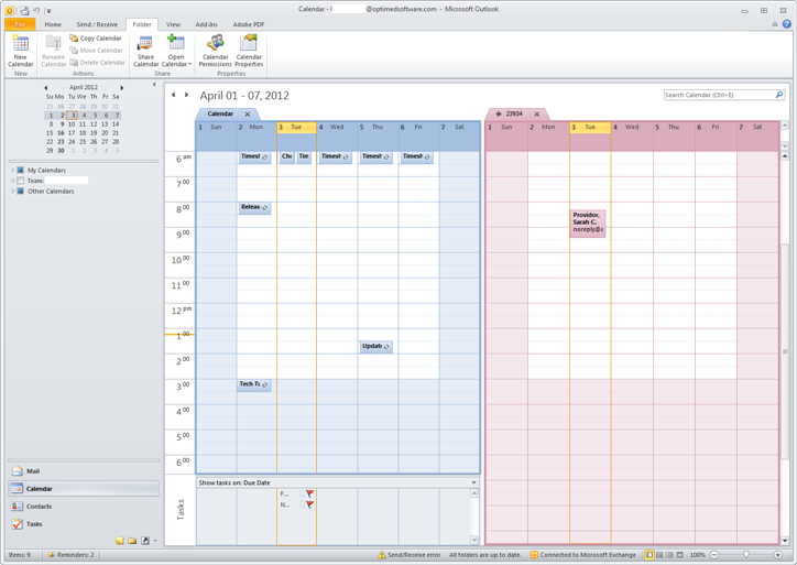 The Accuro Provider calendar opens in Microsoft Outlook to the right of your regular calendar.