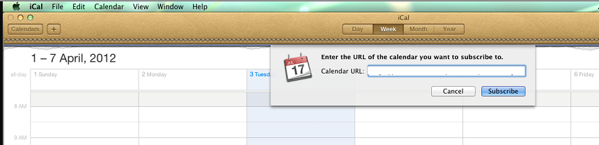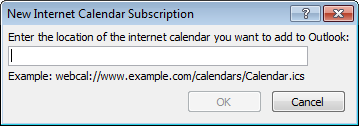 - Type in the location of your calendar. It will be in the format http://clinicurl.com/iCalendar/ .ics click Subscribe.