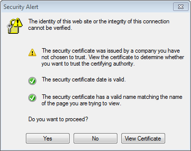 - If a message is displayed about the security certificate, similar to the one below (this is a message from your security software) click Yes to continue.