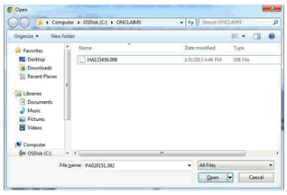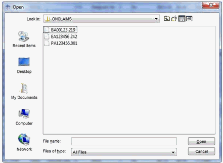 Click on any file to highlight it. Hold down the Ctrl key and while holding it down, type A to select all files. Click on Open. The files will be processed into Accuro and removed from the ONCLAIMS folder.