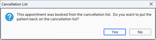 Note: When an appointment is cancelled that is tied to the wait list the user is asked if they want to put the patient back on the wait list. If the user clicks Yes then a window is displayed and they are given the option of changing the wait list status to one of the following: Booked, Completed, Cancelled, Deceased, Tentatively Booked or Re-Book.